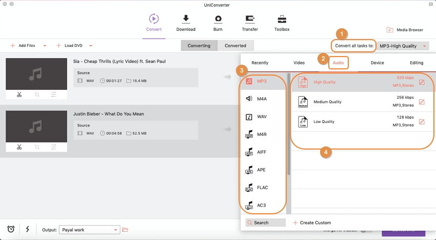 لتشغيل أي موسيقى على ماك mac أو مختلف الأجهزة، يمكنك استخدام أداة تحويل الصوت من قبل UniConverter لتحويل الصوت إلى MP3، wav، wma، M4A، Ac، AC3، .