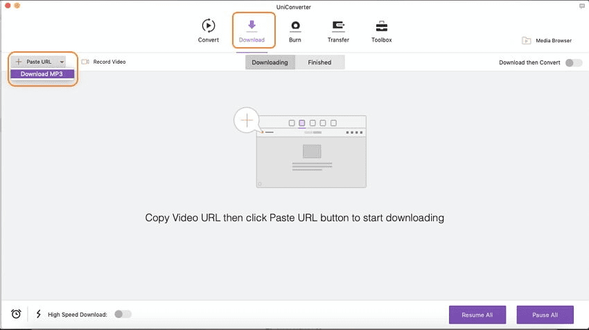 بعد تشغيل البرنامج على ماك الخاص بك، سترى 5 علامات التبويب: تحويل، تحميل، حرق، نقل و الأدوات. ثم انقر على زر "تحميل" للانتقال إلى علامة التبويب "تحميل". لتنزيل MP3، انتقل أولا إلى الموقع الرسمي مثل يوتوب ونسخ عنوان ورل للفيديو أو الصوت الذي تريد تنزيله. بعد ذلك، انقر على الزر "تنزيل MP3" من الزر المنسدل بجوار "لصق عنوان ورل". سيبدأ هذا البرنامج في تنزيل مقاطع فيديو يوتوب وتحويلها إلى MP3.