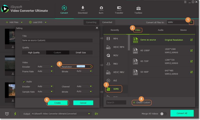 For batch compression of multiple WMV files at a time, you first need to select the target formats of these file by clicking on Convert all files to option. The Video tab shows all supported formats. Next, to change the file parameters, click on the + Create Custom button. Make needed file changes and select parameter values related to frame rate, resolution, and bit rate. Click on the Create button to confirm the settings.