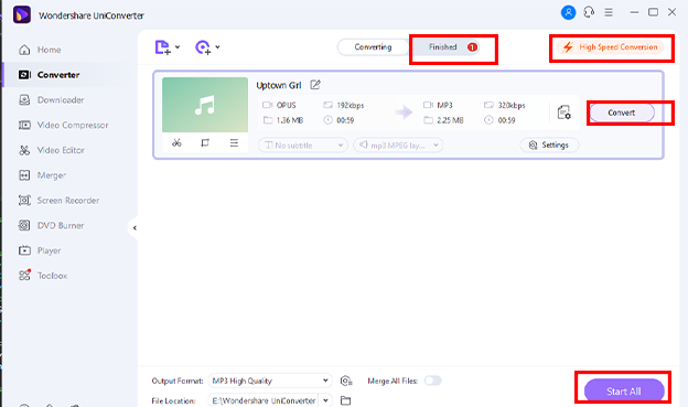Now you can simply click on the Convert or Start all button. With that done, wait for the conversion completion. You can open the "High Speed Conversion" mode at the top right of the window. After that, you can check your MP3 files by clicking “Finished”. Open it, you can listen to your MP3 audio now.