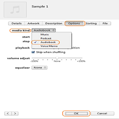 Step 3: From the pop-up window, select the Options tab. Open the drop-down menu at the media kind tab and select the Audiobook option. Playing options start and stop time of the file, volume and equalizer can also be selected from this section. To confirm the selected settings click on the OK button that will convert MP3 to audiobook iTunes.
