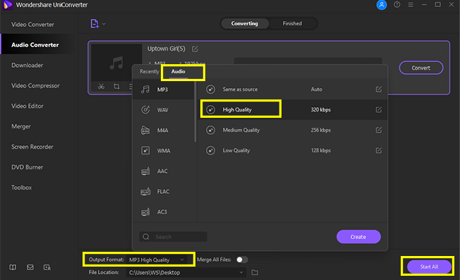 To save your cut mp3 files into any desirable output format, just click output format. Afterward, you can conveniently click on the Convert or Start All button to perform the cutting processes.