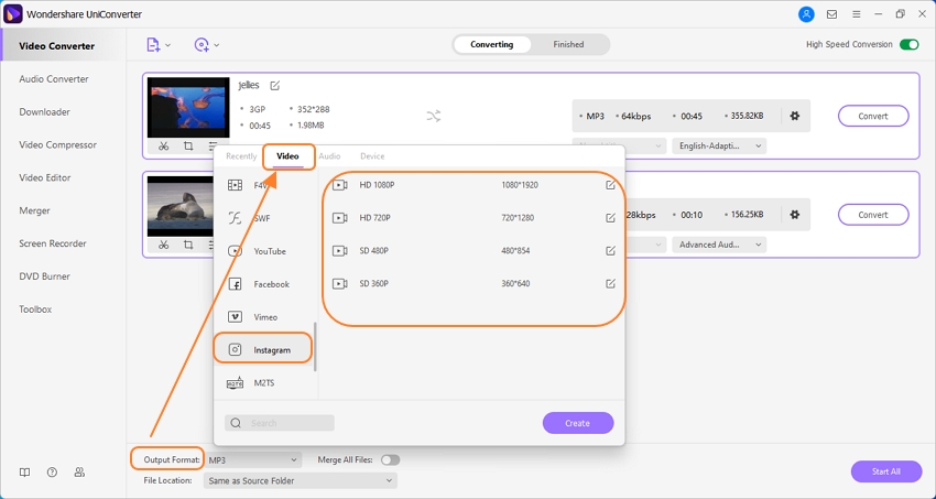 Steps to convert Instagram videos to MP4/MP3 using Wondershare UniConverter: