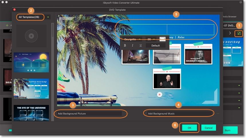 Now it’s time to customize your DVD with the 30+ colourful templates. To add templates, click the yellow pencil-like icon located on the far-right side of your home screen. From the pop-up window, comb through the 36 menu templates and make a pick. You can also set the background picture and music. Again, click OK.