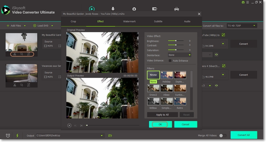 If you want, you can edit your M2TS videos by clicking on the edit icons below the video thumbnails. You can now apply effects, add subtitles, crop, cut, etc. Click OK once you’re done.