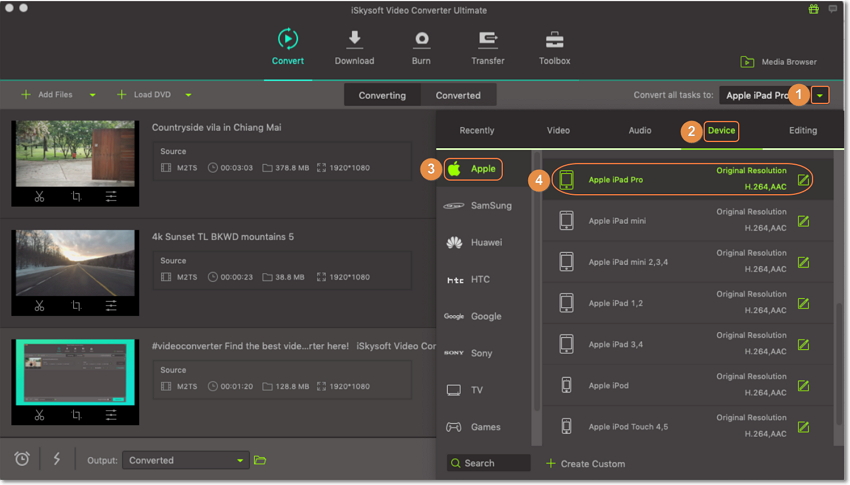 After loading the MTS files, access the format tray situated at the program window’s bottom. Select Device to access the list of output devices. Choose iPad under Apple as the supported output format.