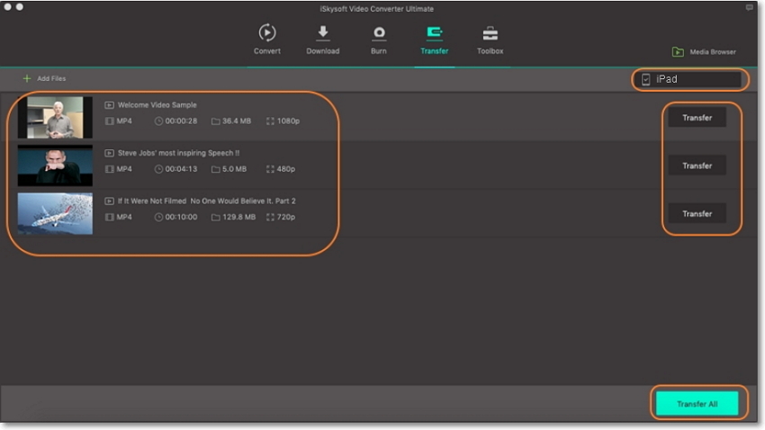 After converting your MTS files to an iPad compatible format, you can now proceed to transfer them to your iPad. Most people may opt to use iTunes for this process. However, there is a better option, through iSkysoft Transfer, which is also considered a great tool. iSkysoft Transfer works just like iTunes because it can copy photos, videos and music to your iPad instantly. However, it is better since it does conversion of formats as well. It is compatible with the latest technology such as Windows 10, MacOS Sierra and latest iPad models. So, it is the ultimate tool to transfer your converted videos to your iPad.
