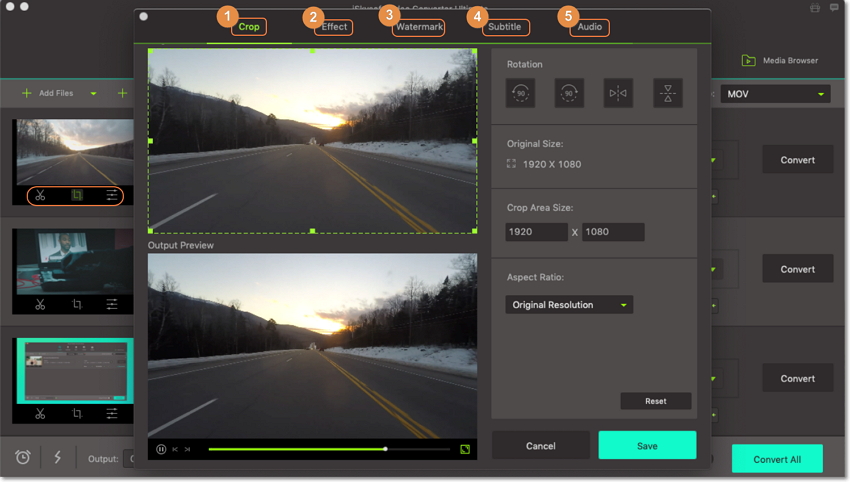 - It is a powerful editor. If you have a long footage that you want to trim before conversion, the tool lets you select the piece of the video that you want and cut the rest away. You can adjust video properties such as contrast, brightness, and saturation and crop pictures in a video. Besides, you can add watermarks, effect filters, and subtitles.