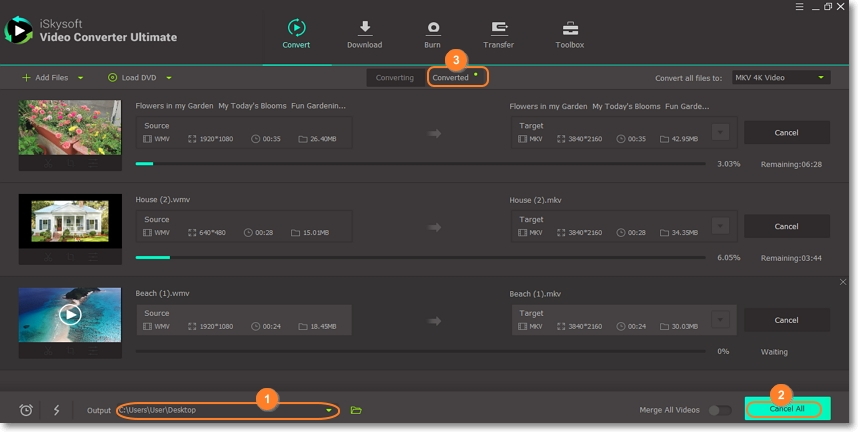 Now choose a destination folder/path from the Output section. Lastly, click the big Convert All button. This software will indicate the conversion progress on the progress bar and save WMV clips on the Converted tab.
