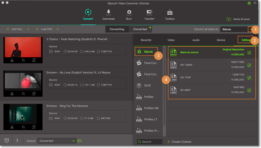 On Convert all files to: at the top right corner. Click on the drop-down menu that is near it and select Editing followed by iMovie.