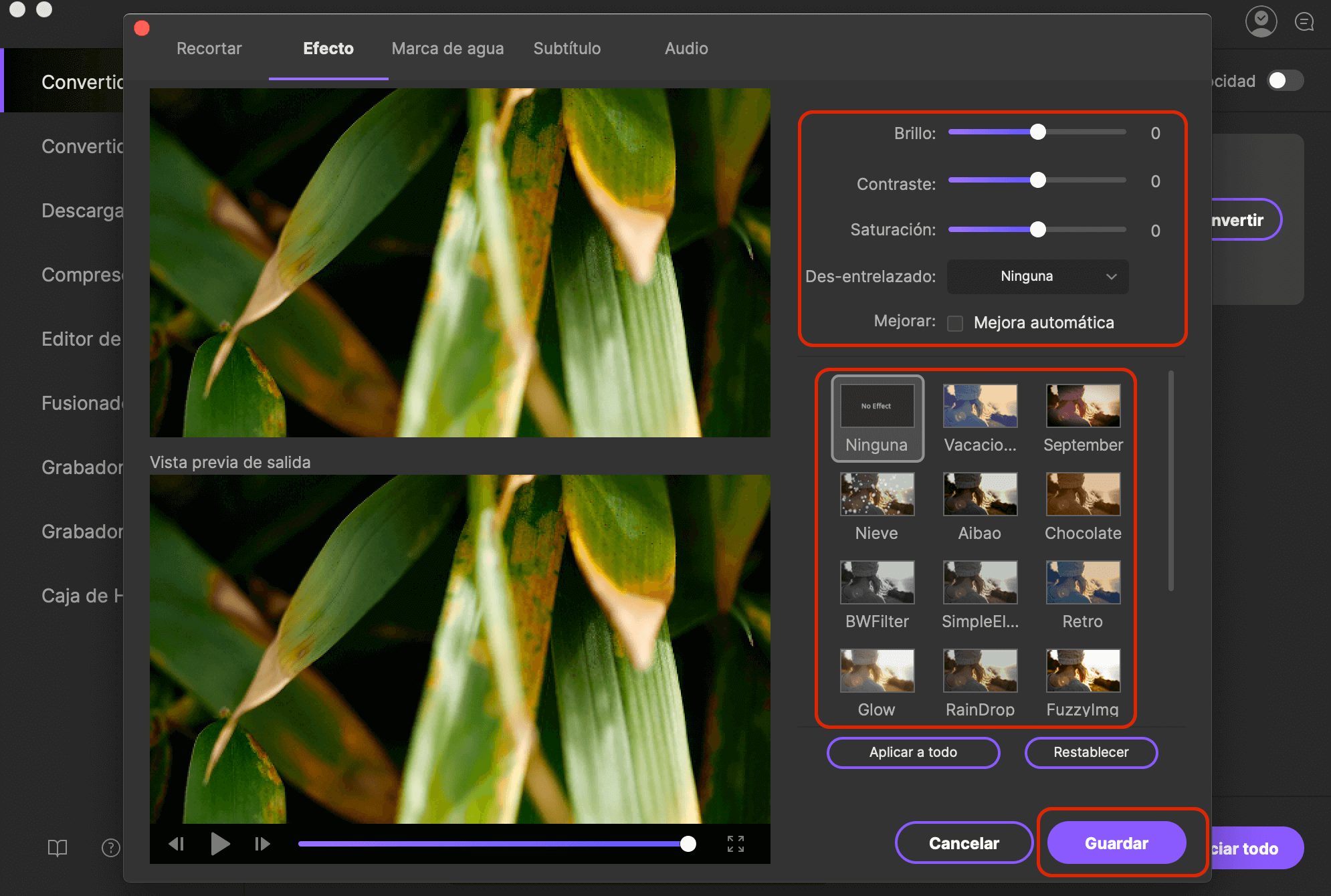 Vaya al icono bajo el video y luego la pestaña "Efecto" para ajustar Volumen, Brillo, Contraste y Saturación, y elige entre 18 efectos preestablecidos para personalizar tu video. Simplemente arrastra y suelta el control deslizante o haz clic en un efecto para aplicarlo. Si no quieres molestarte en realizar un proceso de edición, la mejora automática sería tu mejor opción. Podrás mejorar sus videos con un solo clic.