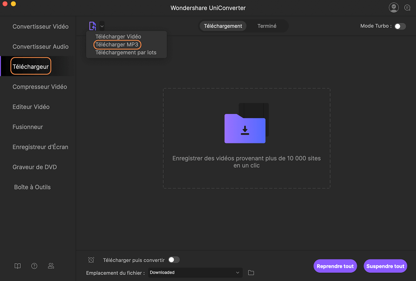 Cliquez sur le bouton "Téléchargeur" dans UniConverter. Pour télécharger le MP3, visitez d'abord le site officiel tel que YouTube et copiez l'URL de la vidéo ou de l'audio que vous souhaitez télécharger. Après cela, cliquez sur le bouton "Télécharger MP3" dans le bouton déroulant à côté de "Coller URL". Ce logiciel va commencer à télécharger et convertir des vidéos YouTube sous le format MP3.