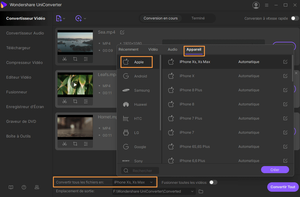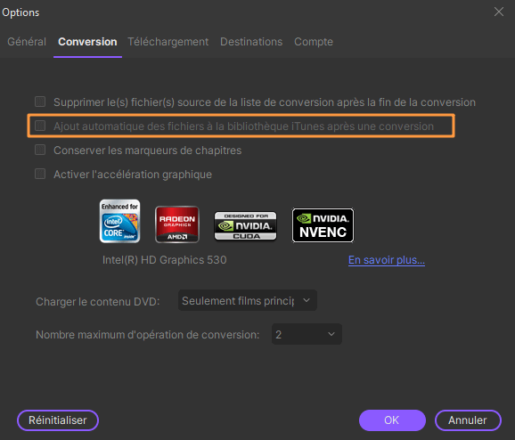Remarque : Si vous voulez ajouter des vidéos à votre bibliothèque d'iTunes afin de les importer sur iPhone, iPad ou iPod, vous pouvez ensuite cliquer sur le bouton "Préférence" et choisisir l'option "Ajout automatique des fichiers à la bibliothèque iTunes suite à une conversion" dans le menu de "Conversion". Ensuite, réglez le périphérique de sortie comme iPhone, iPad ou iPod, de sorte que vous puissiez obtenir le fichier converti sur la bibliothèque iTune, après un simple clic sur le bouton "Convertir" ou "Convertir Tout".