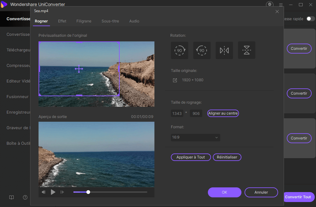 Le programme offre une variété d'options pour modifier votre vidéo, y compris l'outil de rognage et de rotation. Sélectionnez la deuxième icône pour afficherla fenêtre de l'onglet "Rogner". Le programme vous permettra de faire pivoter votre fichier horizontalement, verticalement, à droite ou à gauche, et de personnaliser la taille de découpage.
