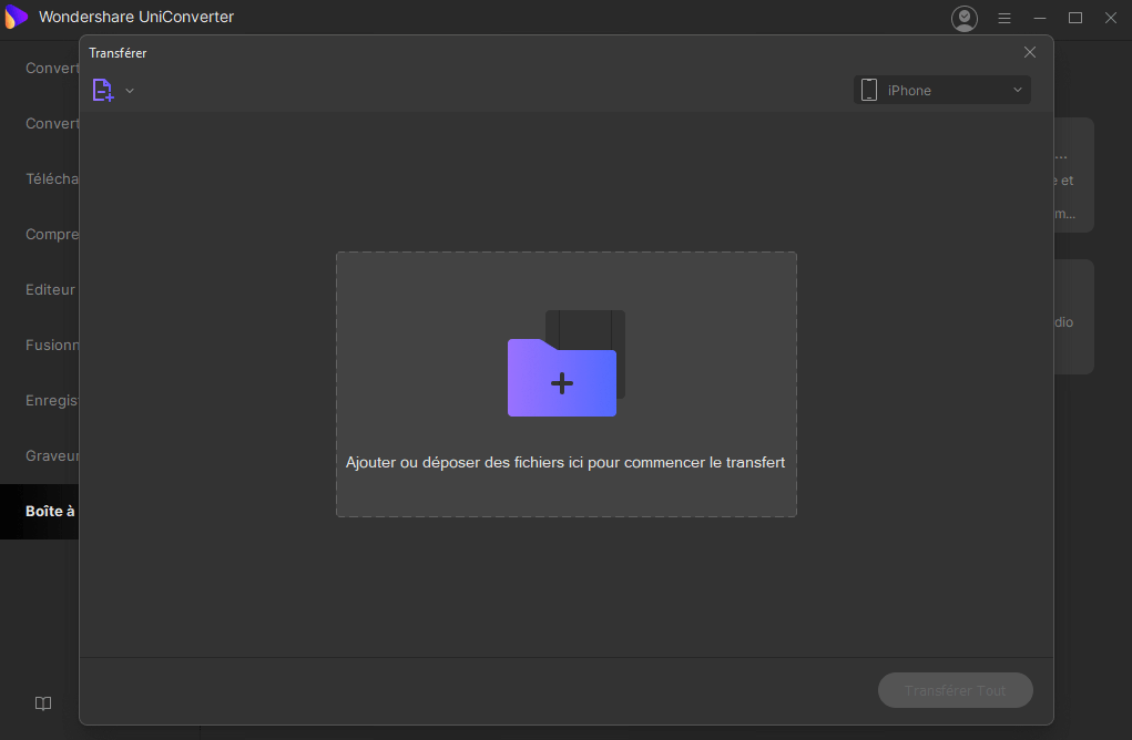 Lancez UniConverter, et passez à l'anglet "Boîte à Outils". Cliquez sur le bouton "Transférer", puis connectez votre disque dur ou votre caméscope à votre PC. Assurez-vous qu'il est reconnu par votre ordinateur.