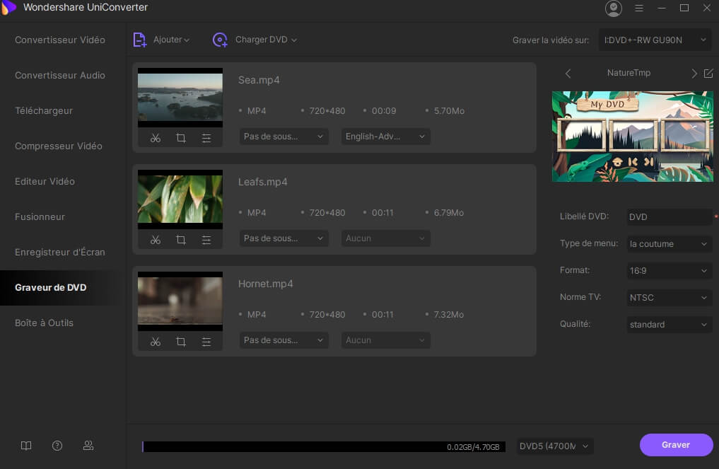 Ajoutez la vidéo souhaitée, cliquez sur «Charger le DVD» pour l'ajouter au dossier DVD, choisissez un modèle de DVD, puis cliquez sur le bouton «Graver».