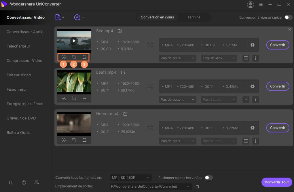 Ajoutez des fichiers vidéo au programme et sélectionnez la fonction d'édition sous la miniature de la vidéo. Vous pouvez facilement rogner, recadrer et ajouter des effets vidéo.