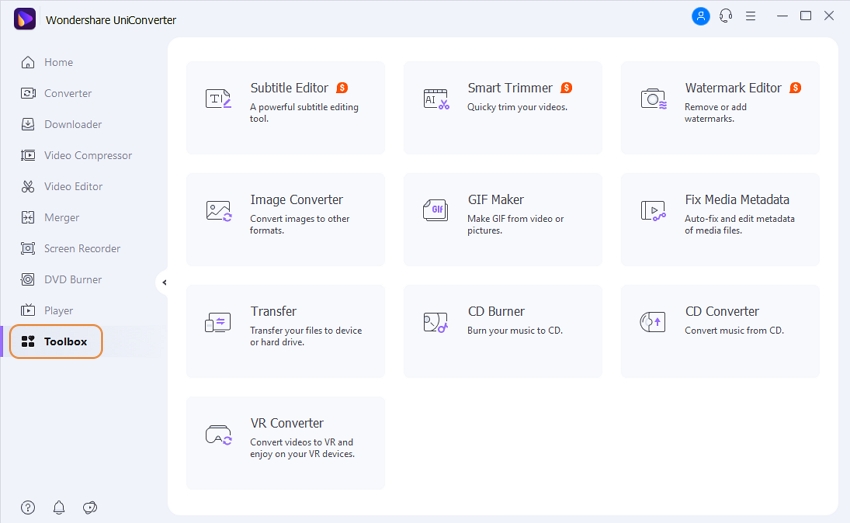 To perform several other additional features, the Toolbox of the software can be used. The features Image Converter, GIF Maker, Fix Media Metadata, Transfer, CD Burner, CD Ripper, VR Converter are enlisted.