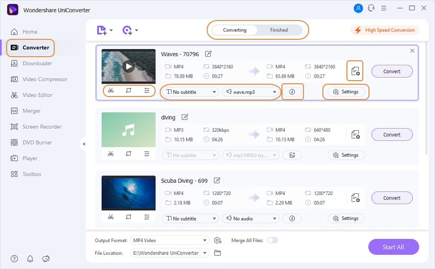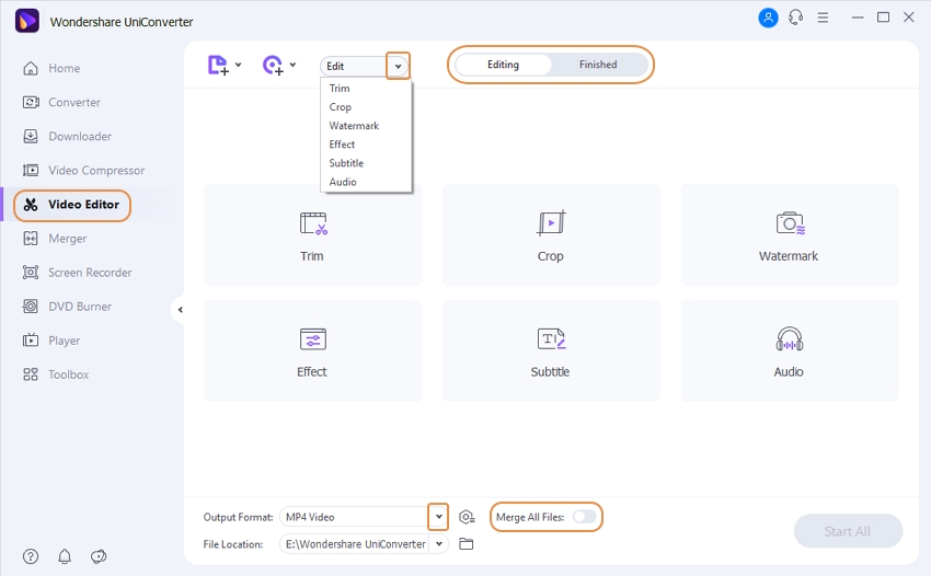To perform various functions, the main interface of UniConverter comes with 5 main modules which are – Video Converter, Audio Converter, Downloader, Video Compressor, Video Editor, Merger, Screen Recorder, DVD Burner, and Toolbox. Details about these modules are listed below.