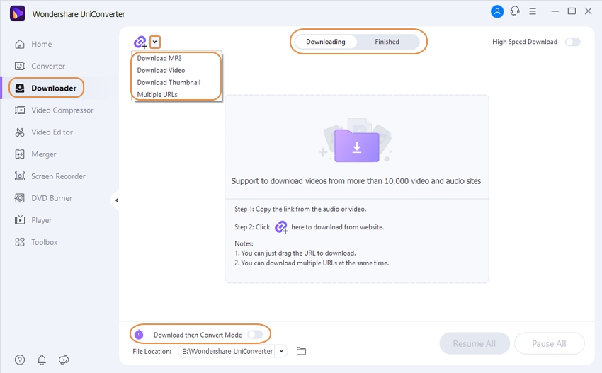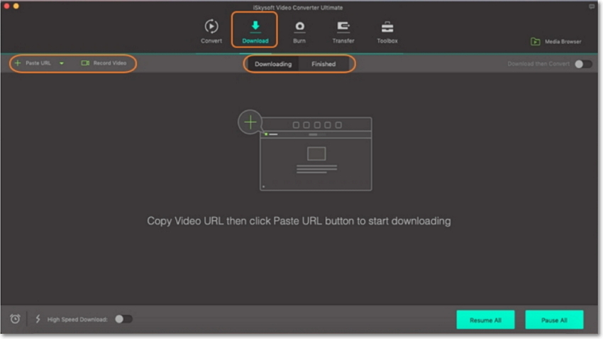 The module of Downloaderfacilitates video download from more than 10,000 sites including some of the major ones like YouTube, Hulu, Facebook, Metacafe, Vevo, and others. The process of video download is simple and quick and the program also allows extracting the music from the video files for playback on iPhone, iPad, iPod, and others. The section has a Downloading tab where the added files and their progress are shown while the Finished tab shows the downloaded videos and audio files. In addition to video download, the section can also be used for recording the streaming videos and desktop activities using the Record Video button.