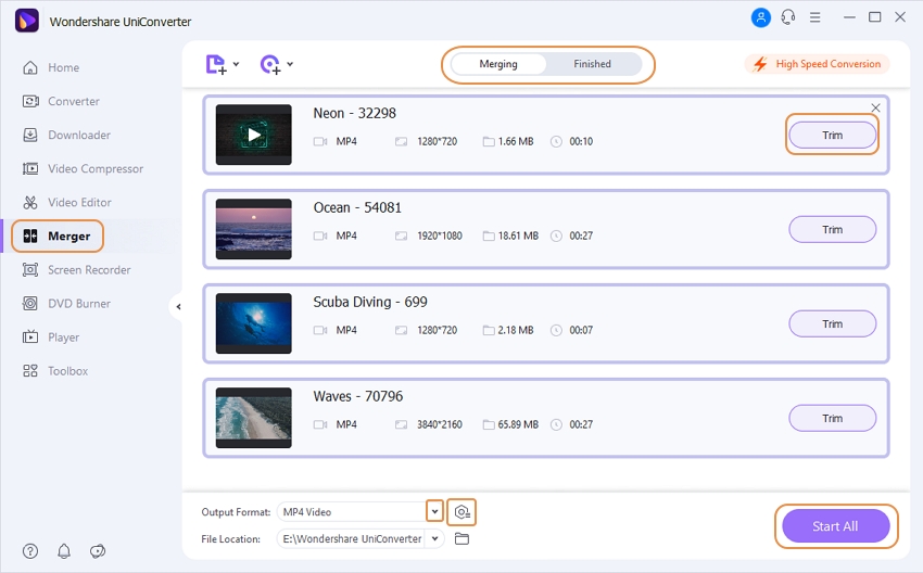 Uniconverter can help you merge multiple files into one fast and simply, which supports importing files from your PC, device, camcorder, or DVD. You also can convert it to different format you select with just one click.