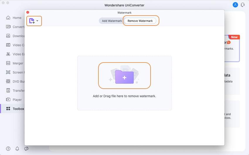 You can remove the watermark by going to Wondershare UniConverter > Toolbox > Watermark Editor. To import your desired videos, click the Add Files icon.