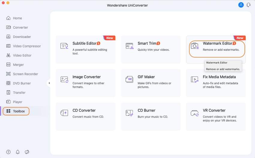 Wondershare Uniconverter can be downloaded, installed, and opened. To use the Watermark Editor, go to Toolbox > Watermark Editor.