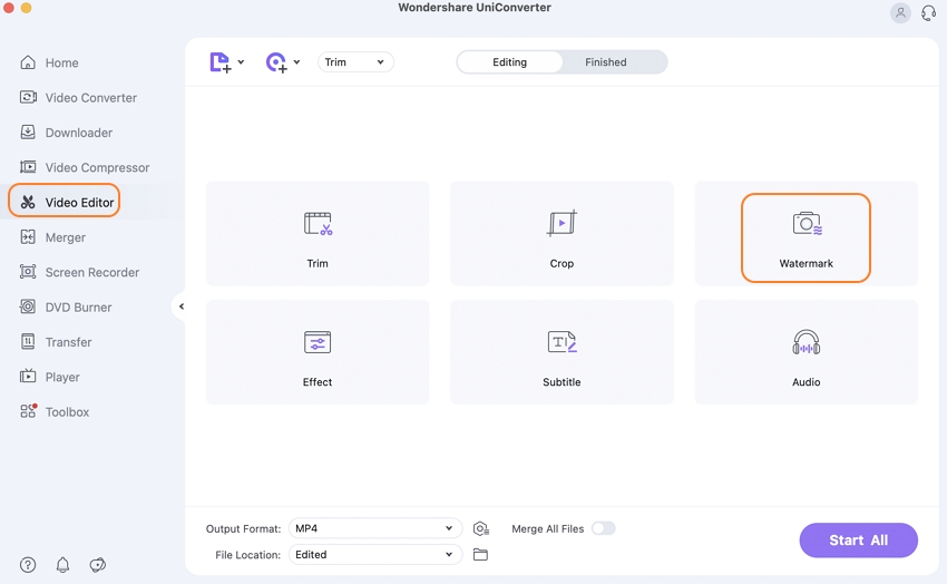 After downloading and installing Uniconverterfor Mac, launch it. To load videos from your Mac, go to the Video Editor tab and select the Watermark option.