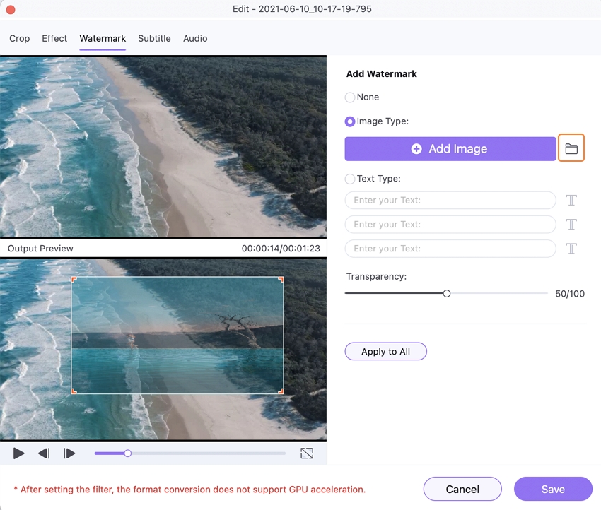 If you want to add an image watermark, go to the Watermark window and select it from your Mac's Image Type. On the Output Preview window, the newly added image will show. Drag and move the image around on the file to change its location. You can also change the size of the image to suit your needs.
