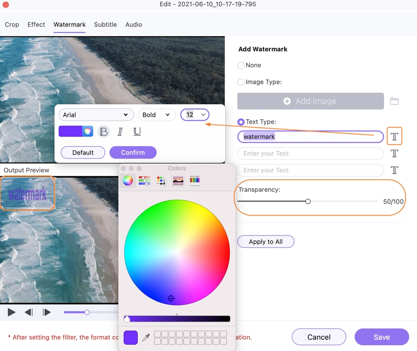 Type a text watermark in the Text Type tab if you wish to add one to your video. To change the text's Format, Size, and Color, click the T sign. The text can also be bolded, italicized, and underlined. In the Output Preview box, move the text around as needed.