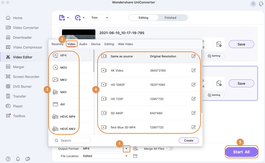Return to the main interface and click the Output Format: tab to choose the output video format. Finally, press the Start All button to begin converting videos on Mac with a watermark.