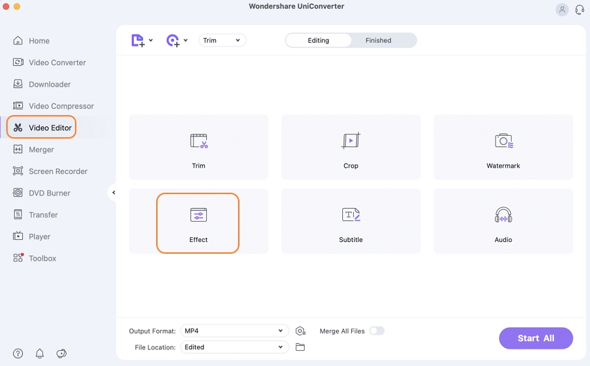 To begin, download Wondershare UniConverter, install it, and run it on your Mac. Then, using the Video Editor tab, add the videos. Then, to open the Effect setting window, click on the Effect section.