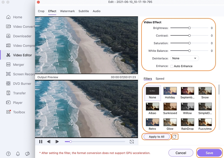 Uniconverter for Mac lets you tweak and change the brightness, contrast, and saturation of your films to create beautiful effects. There are also options to deinterlace the file and enhance the movie here. It also comes with more than 51 video filters for adding interesting effects to your Mac films.
