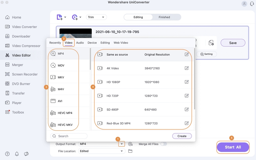 Choose the output video format from the Output Format: tab on the main interface. Finally, select Start All to begin converting videos and save all effects. The stored videos can be found on the Finished page once the procedure is complete.