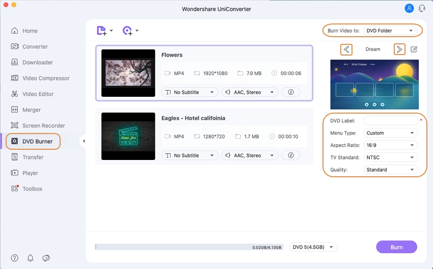 The DVD Burner component of the software makes it simple and quick to burn videos to a DVD/Blu-ray disc on a Mac. If necessary, you can additionally burn the data to a DVD folder or an ISO folder. It can import and personalize your DVD with free menu layouts in a variety of styles, and it supports the most common video formats. With Uniconverter for Mac, you may watch your DVD movies on any playable device without losing quality.