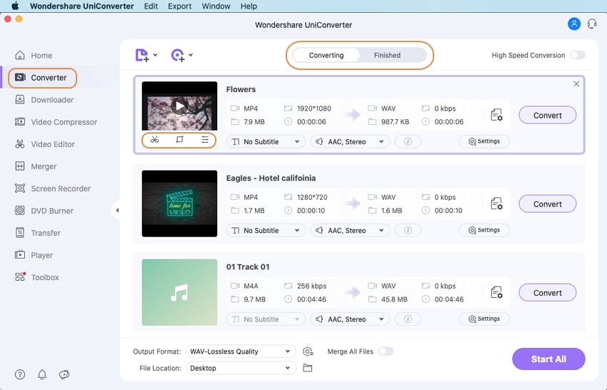 The Uniconverter13 for Mac's Converter tab allows you to convert video and music files on your Mac between a variety of formats, including MP4/MOV/AVI/MKV/FLV/MP3/WAV/WMA, and more. Processing can be done individually or in batches. It also allows you to compress video size on Mac using editing factors such as resolution, bitrate, and video quality. Trim, Crop, Watermark, Effect, Subtitle, and other options can be applied to video files before they are converted under this section. The videos are divided into two tabs: Converting and Converted, to distinguish them and make file management easier. The program can be regarded as the best video converter for Mac due to its ease of use.