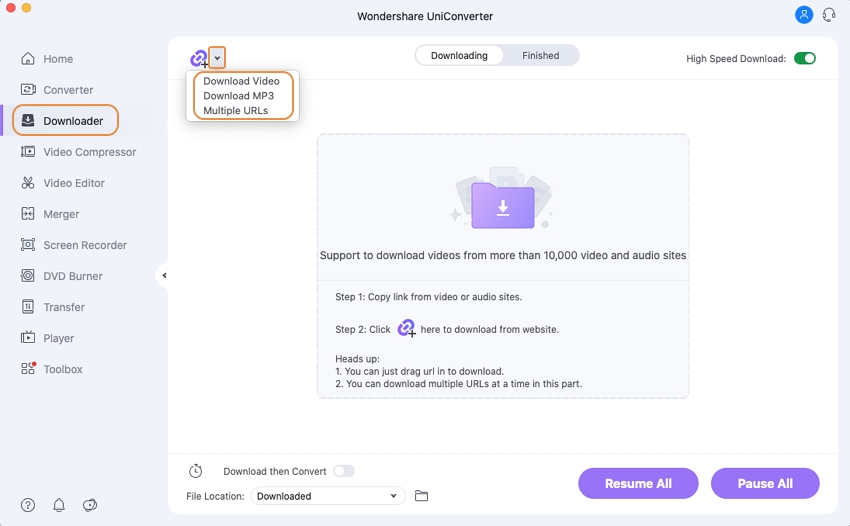 The Downloader component of Uniconverter for Mac allows you to download videos from over 10,000 different websites. The app allows you to download high-quality videos from playback without the need for an internet connection. The downloaded files can also be converted to a variety of device-compatible formats. Simply copy and paste the desired video link to begin the download process. As needed, this component of the software also allows you to record web videos or desktop activities. The software's Downloading tab displays the files that are now being downloaded, while the Finished tab displays the videos that have been successfully downloaded and recorded.