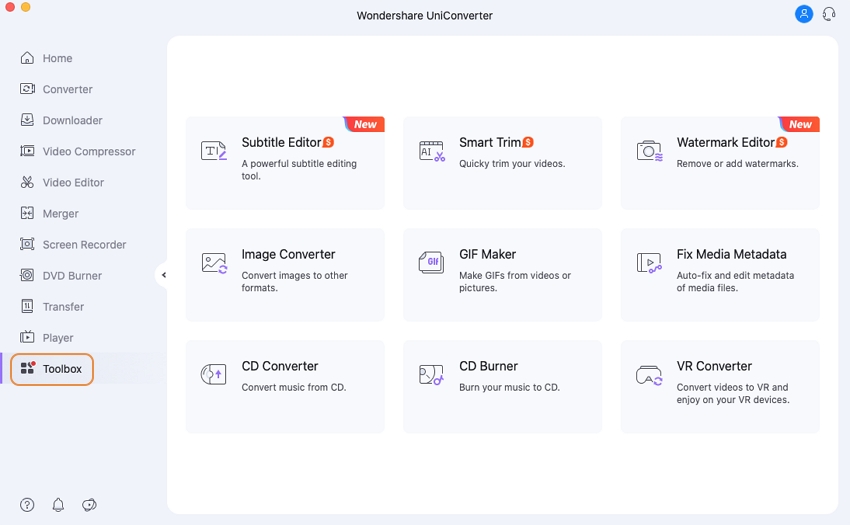 Image Converter, GIF Maker, Fix Video Metadata, Transfer, CD Burner, CD Converter, and VR Converter are among the capabilities available under the Toolbox tab of Uniconverter for Mac.
