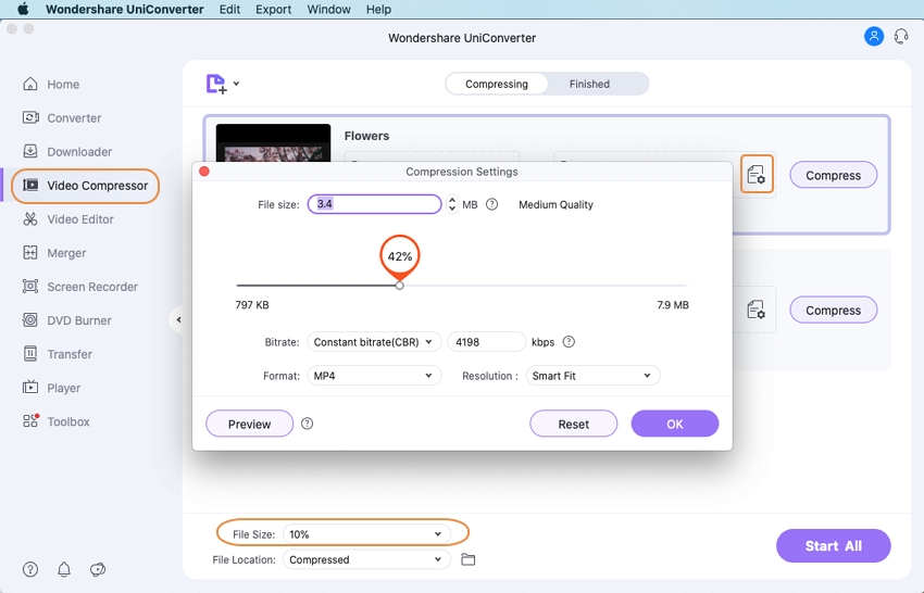 You can lower the file size without sacrificing quality by using the software's Video Compressor tool. It is possible to add files from the system, device, and camcorder. Compression can be done based on the proportion of the file size that you want to reduce. If necessary, custom file parameters can be selected. Compression can also be done based on the size of the file that has to be compressed. A preview option is also available to assess the file quality before processing.