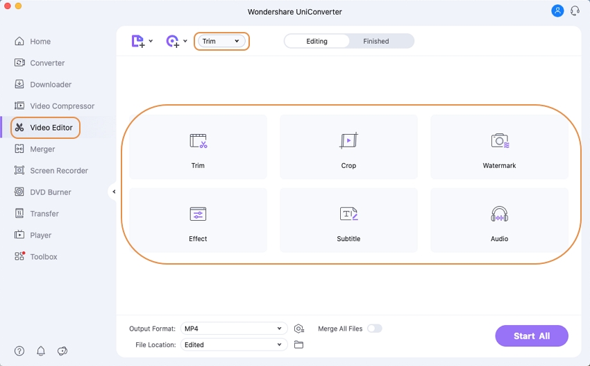 Trim, watermark, crop, effect, subtitle, and audio are just a few of the options available in the built-in Video Editor. For the editing process, local files, as well as videos from smartphones, camcorders, and DVDs can be inserted. For multiple file editing, batch processing is supported; you can choose the output format and even merge the files.