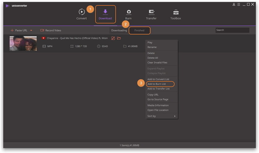 - Method 2: From the left-hand navigation bar, select Video Converter, then go to the Finished tab at the top of the center window, right-click the video you want to make a DVD from, and then select Add to Burn List from the context menu that displays.