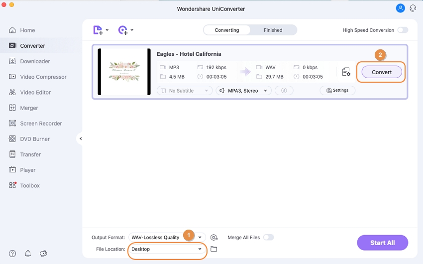 To convert the audio file to the selected format, select an output folder in the File Location field at the bottom and click Convert. Note: If you've added numerous files, you'll need to select Start All in the bottom-right corner to convert them all at once.