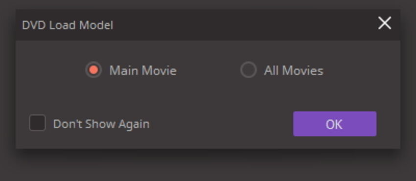 Insert the DVD into the drive, open Wondershare UniConverter, pick the Video Converter category on the left, click the drop-down icon next to Load DVD in the top-left corner of the right pane, and select the drive you inserted the DVD into. Next, on the DVD Load Model box, select Main Movie or All Movies (chosen here for reference) and click OK to import all the files from the DVD to Wondershare UniConverter.