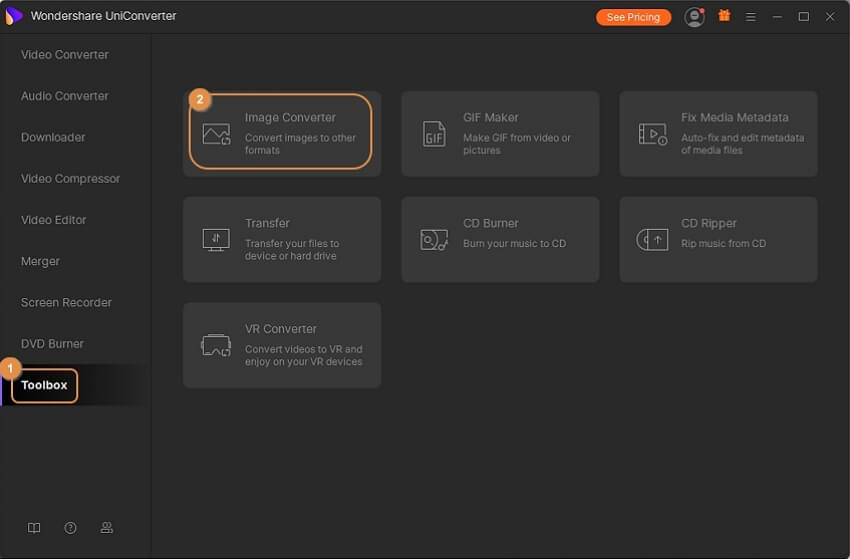 Select the Toolbox > Image Converter option in the Wondershare UniConverter software on your computer.