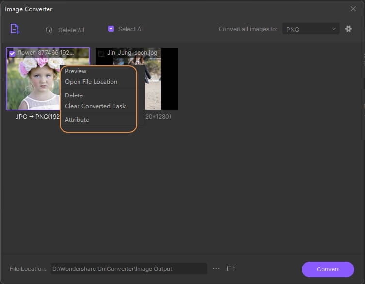 A thumbnail image of the newly added images can be displayed on the software interface. When you right-click the image, a menu of options will appear, including Preview, Open File Location, Delete, Clear Converted Task, and Attribute.