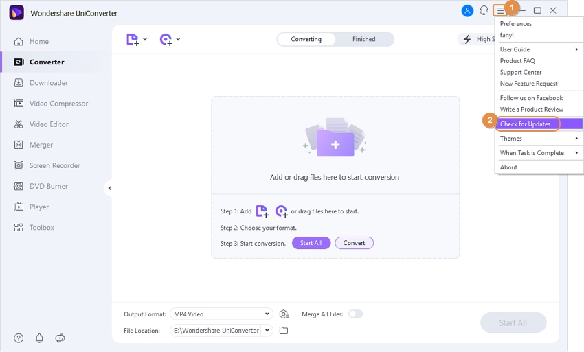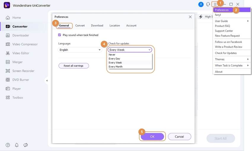Select Preferences from the UniConverter button on the main software interface. From the pop-up window, select the General tab. From the Check for update option, select daily, weekly, monthly, or never as needed to update your program.