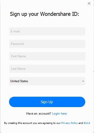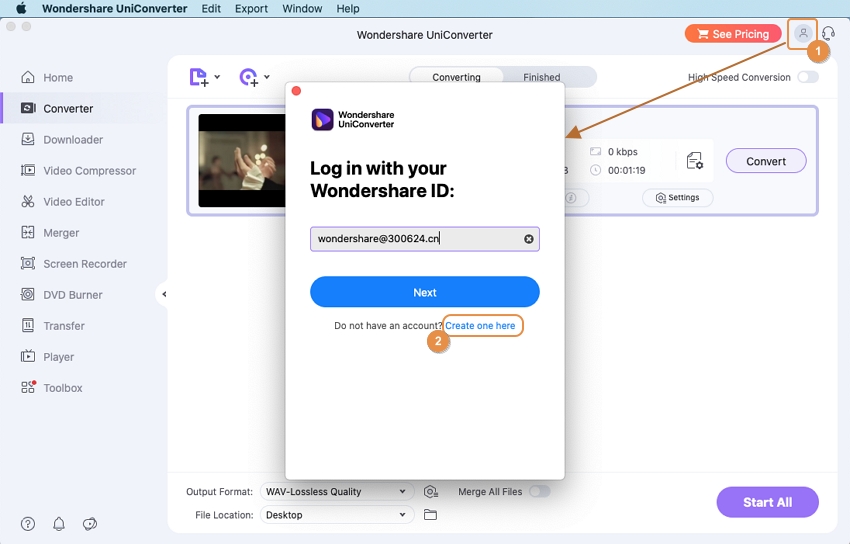 If you haven't already done so, you can create a new account to use Wondershare UniConverter. After hitting the Log In button in the right-top corner, you'll notice the Create account here button on the screen.