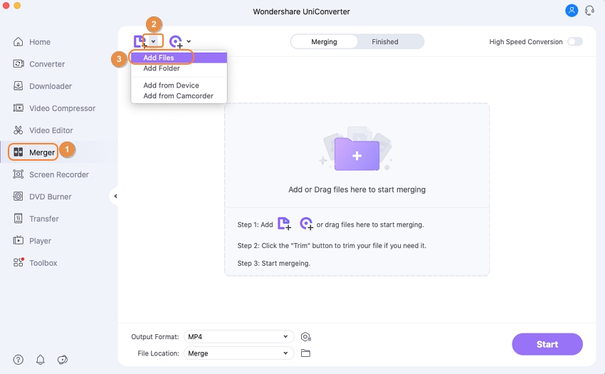 To merge all the clips you imported, make sure the High-Speed Merge switch in the top-right corner is turned on, select an output folder from the File Location field at the bottom, and click Start.