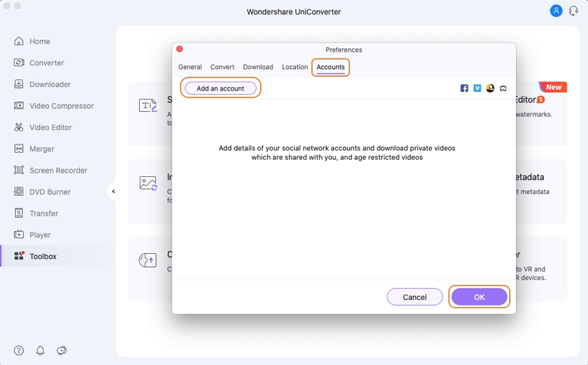 Uniconverter lets yo add the details of your Facebook, Vimeo, Lynda, and Nicinico social networking accounts so that you can download both private and age-restricted videos that have been shared with you on these accounts.