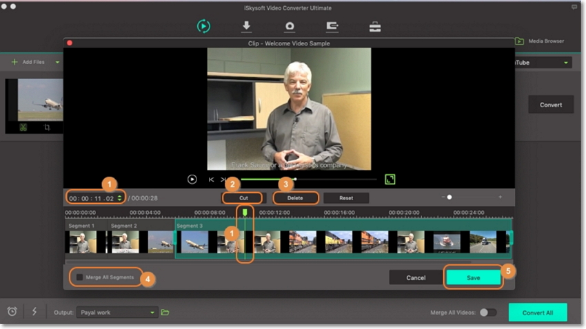 Note: You can set the exact time you want to trim on the marked area in the Mac version as shown below. To begin, select the undesired part you want to trim and then click the Delete and Save buttons.